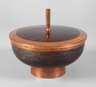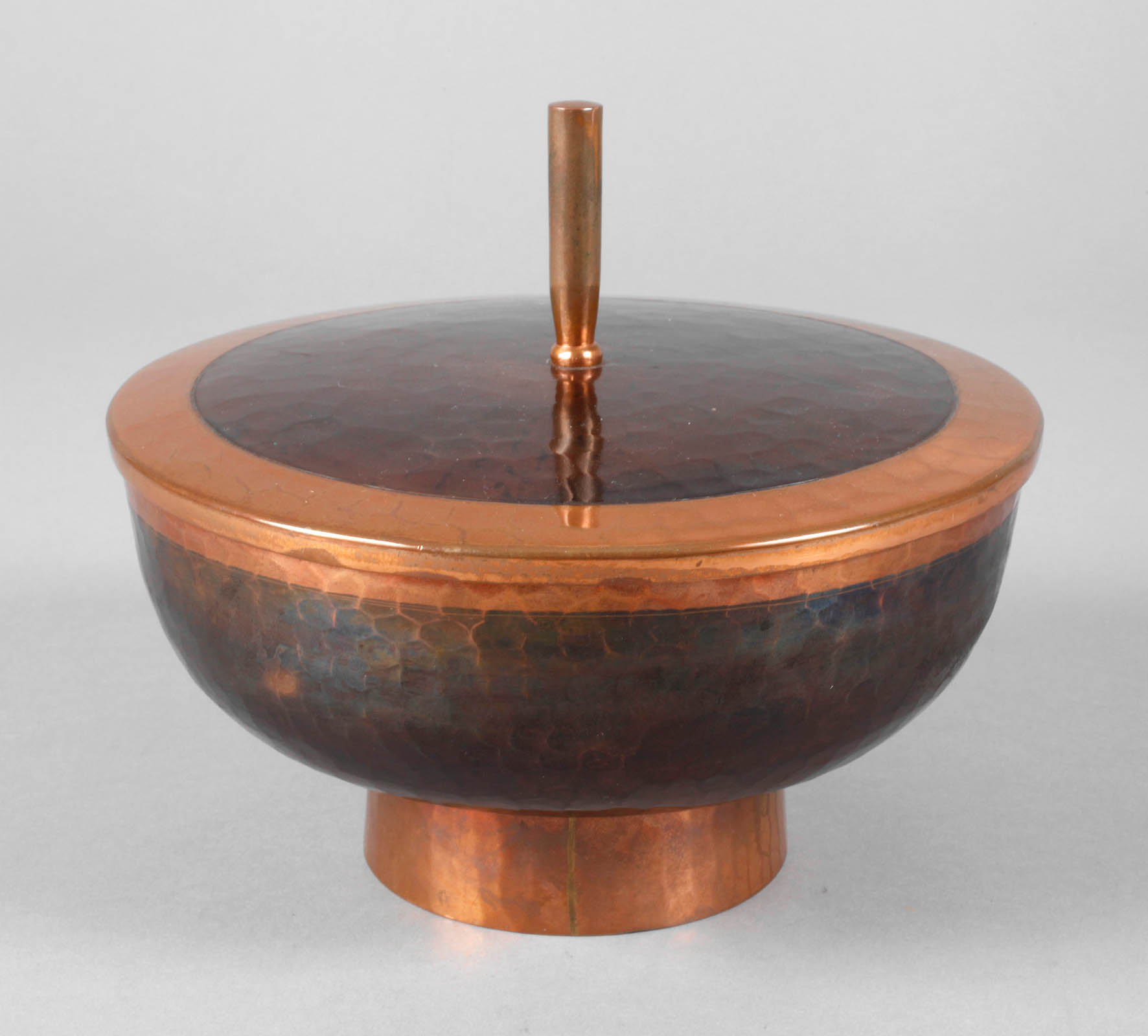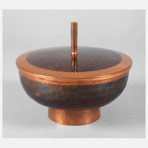 um 1930 oder später, Kupfer getrieben und patiniert, zylindrischer Stand, weite Schale mit abnehmbarem Deckel, hoher Knauf, gestempelt ”Handarbeit HP”, entstanden in der eigenen Werkstatt in Leipzig, normale Altersspuren, D 17 cm.