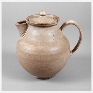 Entwurf wohl Hubert Griemert um 1935, dunkelbraunes Steinzeug, geprägte Burgmarke, gesprenkelte grau-braune Glasur, kugeliger Gefäßkörper, weich in den konischen Hals übergehend, angesetzte Ausgussröhre, fast flacher Deckel mit pilzartigem Knauf, Mündung innen unter dem Deckel minimal bestoßen, H 23 cm. Quelle: Katia Schneider, Burg Giebichenstein, Acta Humaniora, 1992, Tafelband, S. 325, Nr. 229.7., dort Kanne mit gleicher Form, jedoch anderem Deckelknauf. Künstlerinfo: geboren 1905 in Keula/Thürigen, Ausbildung bei Kurt Feuerriegel in Frohburg, Bunzlau und auf der Burg Giebichenstein unter Marguerite Friedländer, Gerhard Marcks und Franz Wildenhain, Goldmedaille bei der Weltausstellung in Paris, verschiedene weitere Preise. Quelle: Gisela Reineking von Bock, Keramik des 20. Jh. Deutschland, Keysersche Verlagsbuchhandlung München 1997.