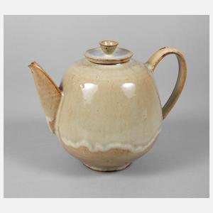 1940er Jahre, Prägemarke, dazu ein unleserliches Zeichen, ziegelroter Scherben, zwei übereinander laufende grünliche und grüngraue Glasuren, gegrateter Henkel, kantiger Ausguss mit unregelmäßiger Öffnung, Deckel mit gemuldetem Knauf, guter unbeschädigter Zustand, H 19 cm. Künstlerinfo: geboren 1905 in Keula/Thürigen, Ausbildung bei Kurt Feuerriegel in Frohburg, Bunzlau und auf der Burg Giebichenstein unter Marguerite Friedländer, Gerhard Marcks und Franz Wildenhain, Goldmedaille bei der Weltausstellung in Paris, verschiedene weitere Preise. Quelle: Gisela Reineking von Bock, Keramik des 20. Jh. Deutschland, Keysersche Verlagsbuchhandlung München 1997.