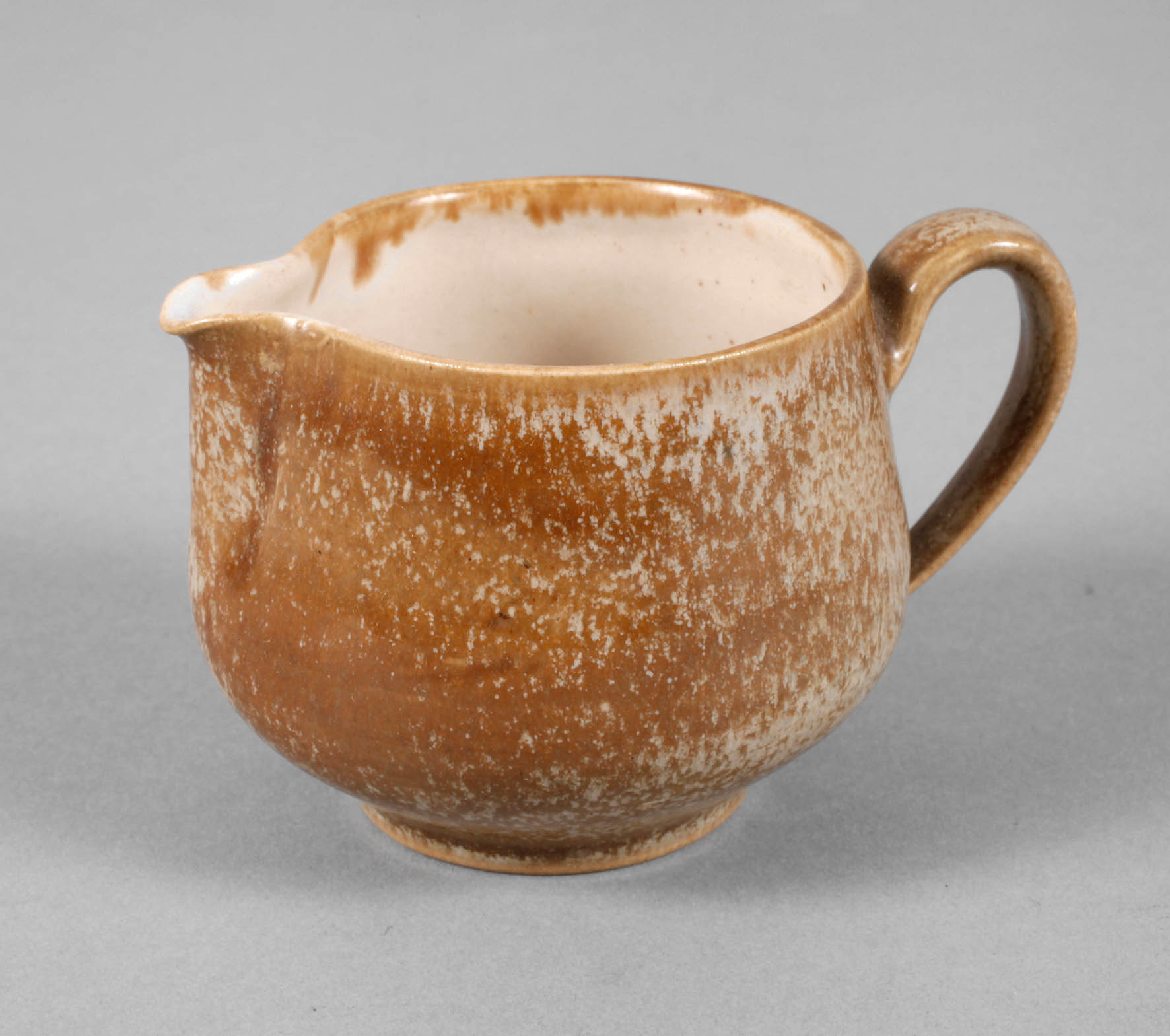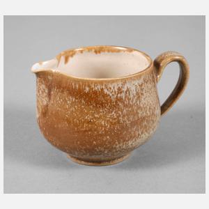 Kännchen um 1970, Pinselmarke ”LB”, cremefarbener Scherben, gesprenkelte Glasur in Creme und hellem Braun, unbeschädigt, H 5 cm. Künstlerinfo: geboren 1915, Schülerin von Hubert Griemert, Otto Lindig und Gerhard Marcks.