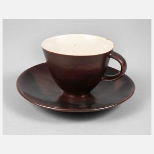 Stempelmarke um 1922–1960, helles Feinsteinzeug, braun und cremefarben glasiert, konische Tasse, geschwungen in den Stand übergehend, Bandhenkel mit Mittelgrat, passende Untertasse, diese ungemarkt, sehr gute unbeschädigte Erhaltung, H 8 cm.