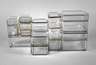 Entwurf 1938, Ausführung Vereinigte Lausitzer Glaswerke AG Weißwasser, Rautenmarke, klares feuerfestes Glas, verschiedene rechteckige und quadratische Gefäße, vorwiegend mit Deckeln, dabei eine Sauciere, alles gut erhalten, L 9, 12 und 18 cm.