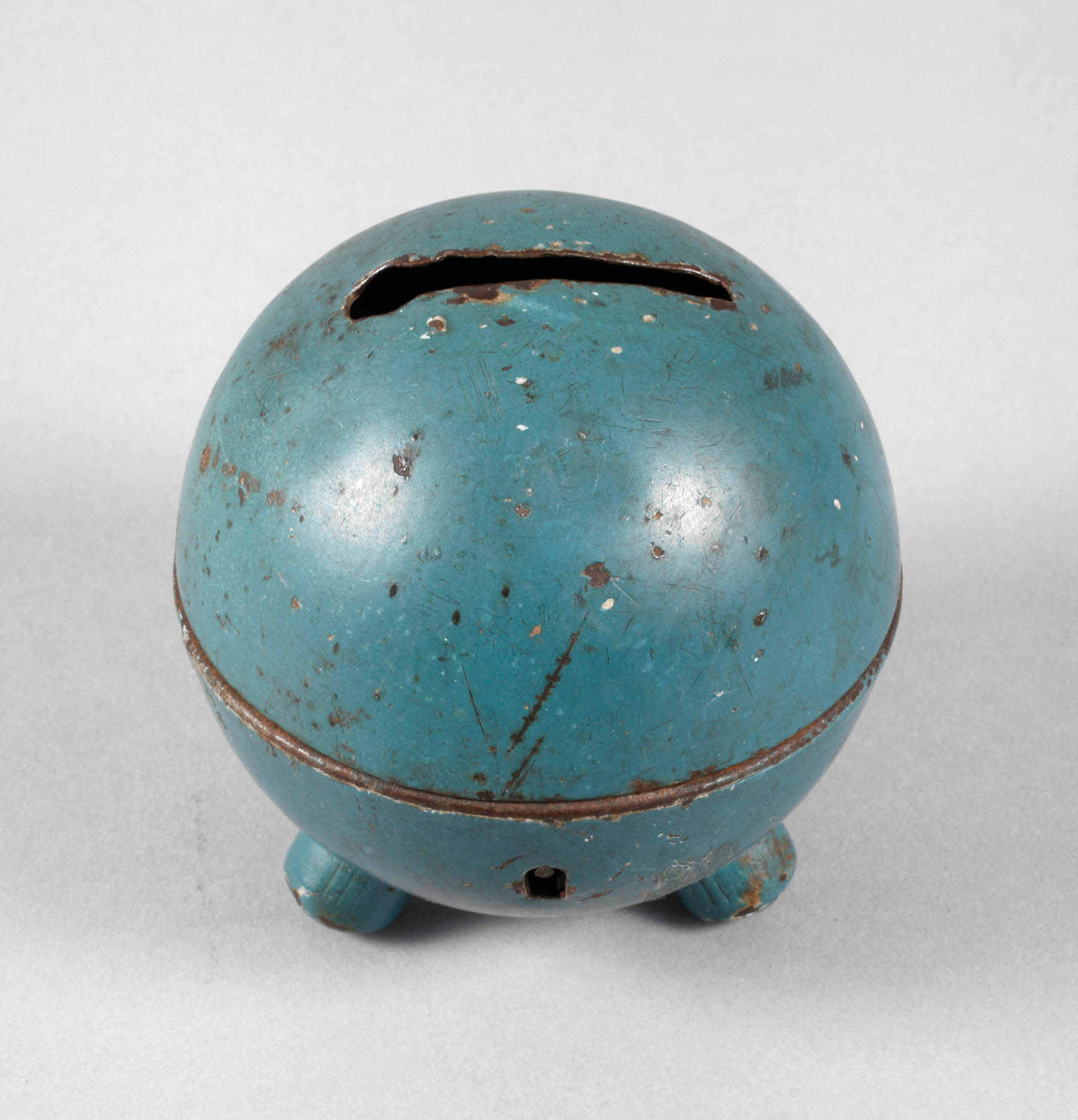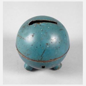 um 1925, am Boden gemarkt, mittig geteilter kugelförmiger Korpus aus Weißblech, petrolfarben gefasst, auf drei kurzen Füßen, mit Schlüssel, stärkere Erhaltungsmängel, Schloss def., H 8 cm.