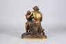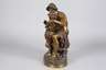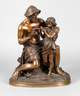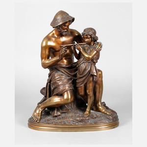 Ende 19. Jh., recto auf der Plinte signiert ”Coinchon”, Bronze hell-bräunlich patiniert, auf naturalistischer Plinthe, auf einem Baumstumpf sitzender Vater, seiner Tochter das Flötenspiel beibringend, beide in leichte Hirtengewänder mit viel Faltenwurf gehüllt, der Vater mit freiem Oberkörper und Hut, die Plinthe unten getreppt und mit Holz gefüllt, gute Erhaltung mit geringen Altersspuren, H gesamt 42 cm. Künstlerinfo: Jaques-Antoine-Théodore Coinchon (1814 Moulins bis 1881 Paris), lernte unter David D'Angers an der Ecole des Beaux Arts in Paris, beschickte den Salon in Paris. Quelle: Thieme/Becker.