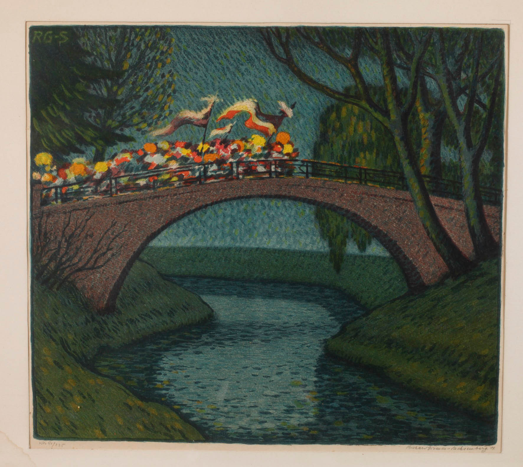 Kinderschar beim Überqueren einer Brücke in abendlicher Dämmerung, Farblithografie, unter der Darstellung signiert und datiert „Richard Grimm-Sachsenberg (19)11“ und nummeriert 9/125, im Stein monogrammiert „RG-S“, geringe Altersspuren, unter Passepartout, hinter Glas gerahmt, Darstellungsmaß ca. 32,5 x 36,7 cm. Künstlerinfo: eigentlich Richard Grimm, dt. Maler, Graphiker, Buch- und Schriftkünstler (1873 Untersachsenberg/Vogtland bis 1952 Leipzig), studierte 1892–93 an der Akademie Dresden, 1893–94 an der Privatmalschule Holoszy und 1894–98 an der Akademie in München bei Karl Raupp sowie Malschüler bei Anton Azbè, schuf Beiträge für die Münchner Zeitschriften „Fliegende Blätter“, „Jugend“, „Simplicissimus“ und „Pan“, 1898 Lithographenlehre in Leipzig, anschließend in Berlin, Dresden und München tätig, 1900 Italienreise, 1902–04 auf Vorschlag von Peter Behrens Lehrer an der Kunstschule Krefeld, 1905 Meisterschüler bei Ludwig von Hofmann und Rückkehr nach Leipzig, verwendet nun den Künstlername „Grimm-Sachsenberg“ als Bekenntnis zu seinem Geburtsort, fortan für die Bugra und als freier Künstler in Leipzig tätig, vertreten in den Kupferstichkabinetten Dresden, München und Leipzig und im Vogtlandmuseum Plauen, Mitglied im Reichsverband Bildender Künstler Deutschlands, im Leipziger Künstlerbund und im Verein Deutscher Buchgewerbekünstler Leipzig, Quelle: Thieme-Becker, Vollmer, Dressler, Goldstein, Matrikel der Münchner Akademie, Internet und Frank Weiß ”Malerei im Vogtland”.