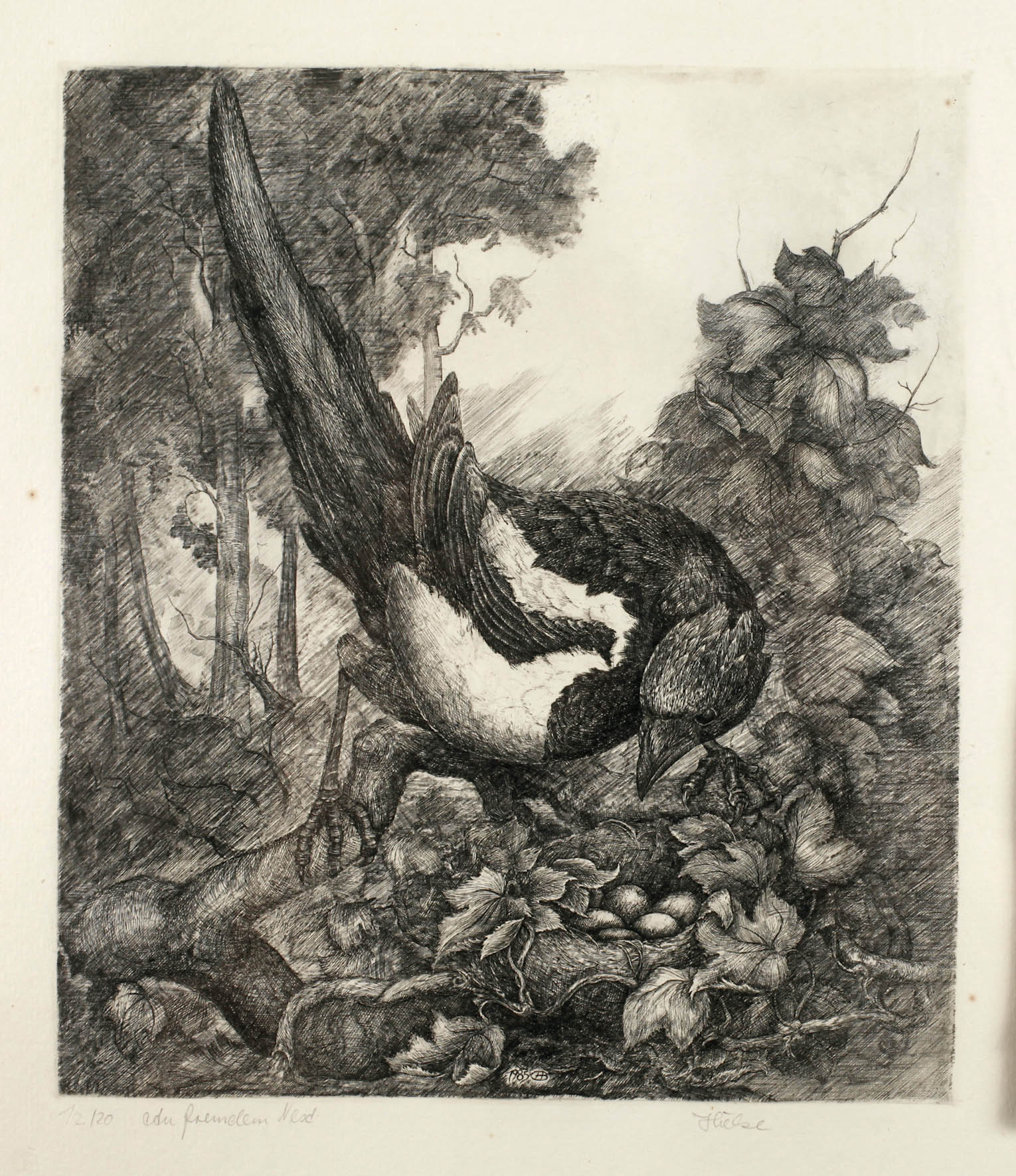 Elster an einem Nest, umgeben von Blattwerk, Kupferstich, unter der Darstellung handsigniert „Hieke“, nummeriert 12/20 und betitelt „Am fremden Nest“, in der Platte datiert und ligiertes Monogramm „1985 HB“, geringe Erhaltungsmängel, hinter Glas gerahmt, Plattenmaß ca. 24,5 x 21,5 cm. Künstlerinfo: dt. Maler, Grafiker und Exlibriskünstler (geb. 1944 in Plauen), nach Studium ab 1987 freiberuflich in Elsterberg tätig, 2002 Beteiligung an der Ausstellung „Beispiele zeitgenössischer Kunst aus den Neuen Bundesländern“ im Bundeskanzleramt Berlin, Quelle: Internet.