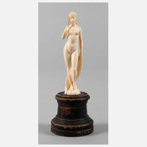 wohl Erbach, 19. Jh., stehende, unbekleidete weibliche Schönheit, eine Hand verschämt zum Haar erhoben, die andere das herabgeglittene Tuch haltend, auf Holzsockel montiert, Altersspuren, H ges. 13,5 cm.