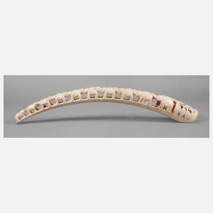 Anfang 20. Jh., naive Schnitzerei, durchbrochen gearbeitet mit halbplastischen Elefanten, Schlangen und Blattmotiven, mehrfach alt geklebt, L 90 cm.