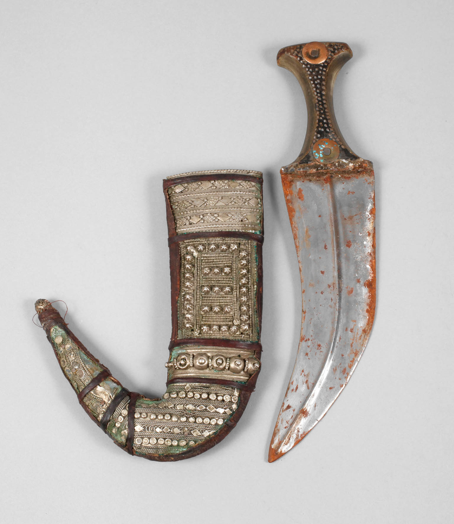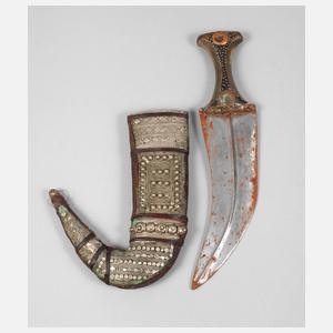 Jemen, Anfang 20. Jh., ornamental verzierter Horngriff, breite gekrümmte Klinge mit Mittelgrat, belederte Holzscheide mit geprägten Verzierungen aus Neusilber, Klinge rostnarbig, Z 3, L 30 cm.