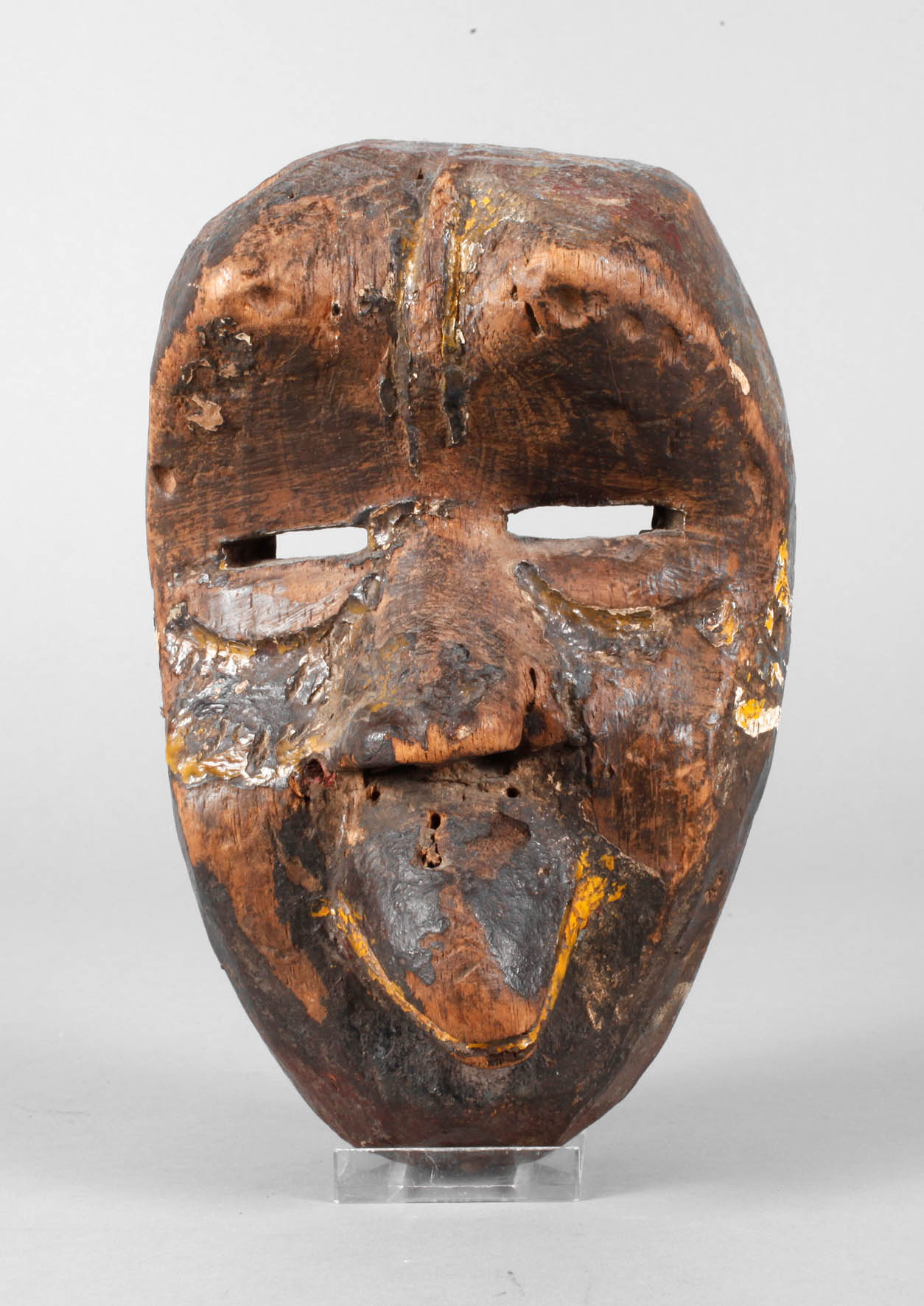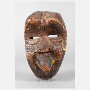 Akan/Baule, 1. H. 20. Jh., aus weichem Tropenholz gefertigt, Nasen und Augenbereich durchbrochen gearbeitet, schnabelartige Lippen, Reste alter Farbfassung, stärkere Gebrauchsspuren, H ca. 24 cm.