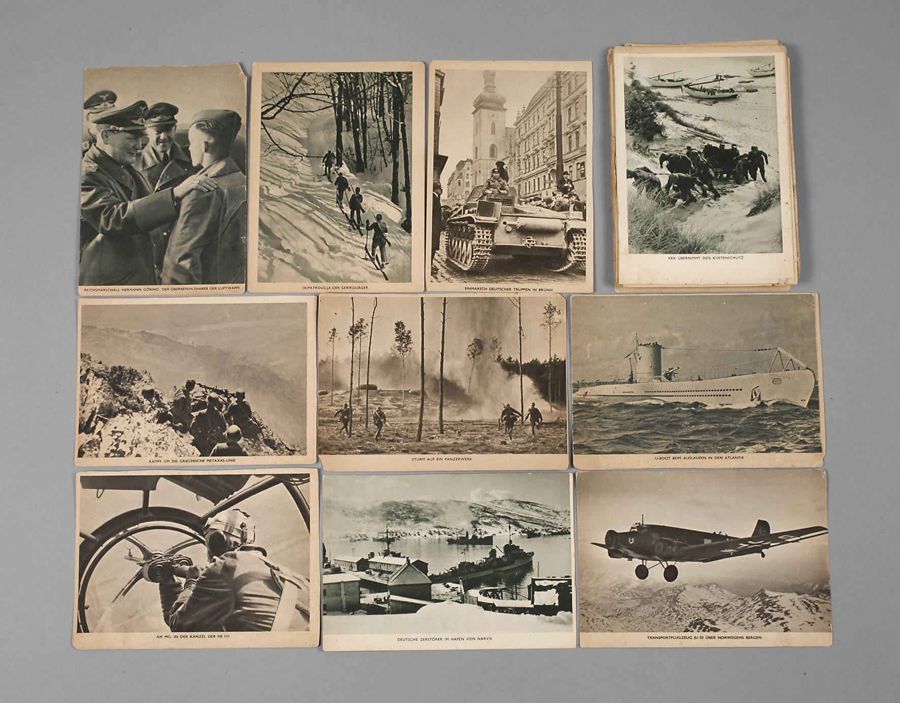 2. WK, ca. 30 Karten, Verlag ”Die Wehrmacht”, Berlin, Aufnahmen von versch. Fotografen, Abb. der Land-, See- und Luftstreitkräften im Einsatz, postalisch ungelaufen, gegilbt und vereinzelt randlädiert.