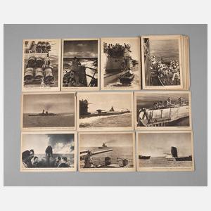 2. WK, ca. 40 Karten aus der Reihe Deutscher Marine-Kalender 1942, Verlag ”Die Wehrmacht”, Berlin, fotogr. Aufnahmen von Winkelmann u.a., Abb. versch. Kreuzer, U-Boote, Besatzung, div. Einsätze etc., postalisch ungelaufen, gegilbt und vereinzelt randlädiert.