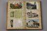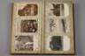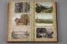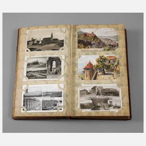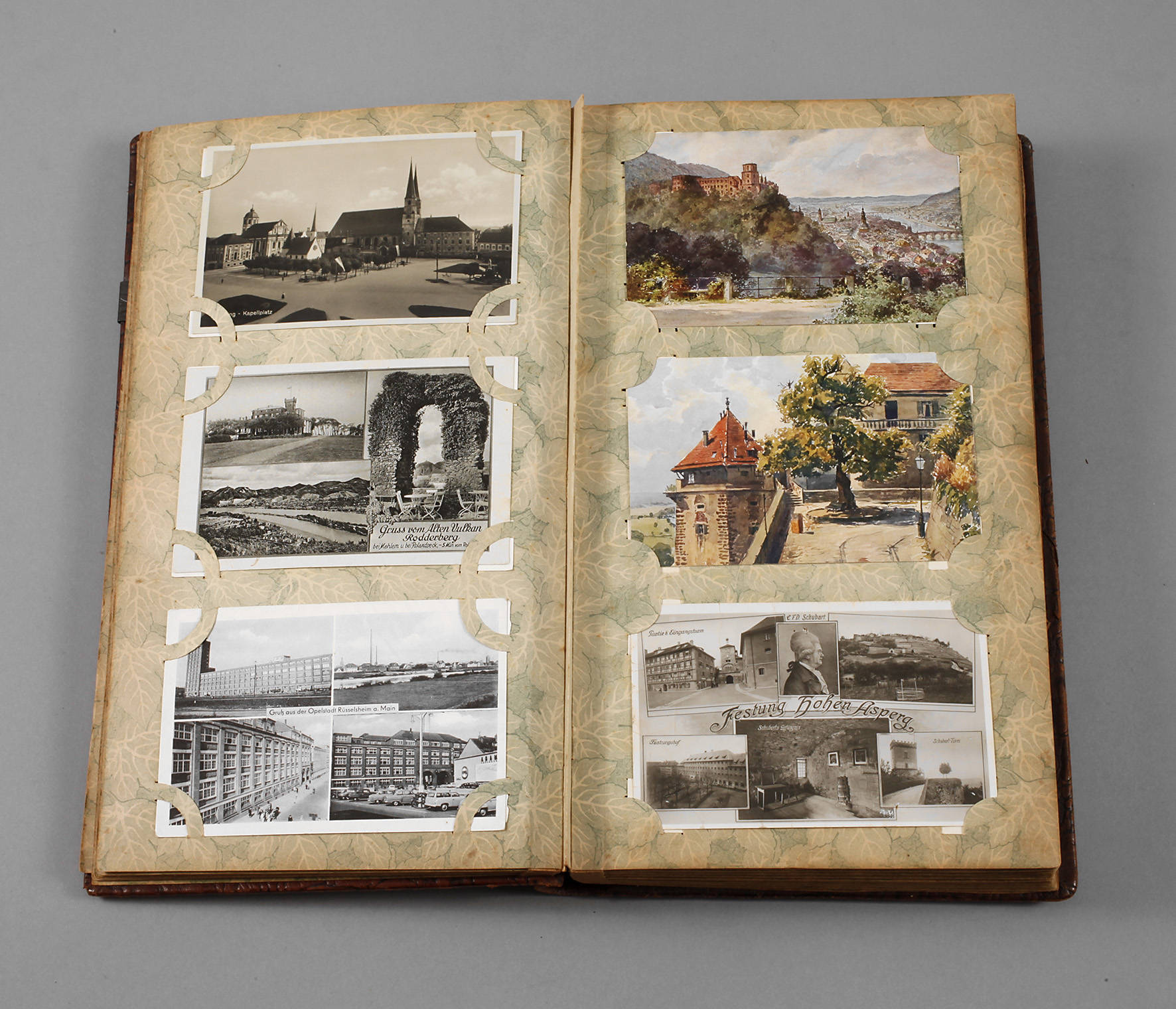 1. Hälfte 20. Jh., ca. 280 Ansichtskarten, darunter wenige Gruß aus-, Kitsch- und Kunstkarten, teils farbig lithogr. und postalisch gelaufen, in vollständig besammeltem Einsteckalbum der Zeit mit illustr. Blättern und dekorativ blindgeprägtem Ledereinband mit Metallapplikation in Manier des Jugendstils, Album mit min. Alters- und Gebrauchsspuren, Maße 34 x 20 cm.
