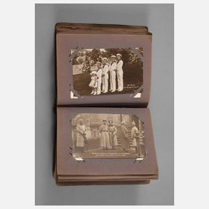 um 1910, ca. 90 Fotokarten mit Portraits der Kaiserfamilie und des dt. Hochadels, vereinzelt postalisch gelaufen, in fast vollständig besammeltem Einsteckalbum der Zeit, Pappeinband mit geprägtem EK und Kordelbindung, min. Alters- und Gebrauchsspuren, eine Karte mit Eckabriss, Maße Album 19 x 15,5 cm.