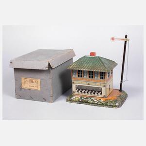 Modell 12/6112/2, um 1930, gemarkt, Blech farbig handlackiert und lithogr., passend zu Spur 0, zweistöckiges Gebäude mit durchbrochen gearbeiteten Fenstern, Treppe mit Geländer und geprägtem Walmdach mit Kamin, für sechs Anschlüsse, auf Geländesockel mit Signalmast montiert, in orig. Karton mit Bezeichnung, kaum bespielter Zustand, Maße Sockel 18 x 13,5 cm, H 15 cm.
