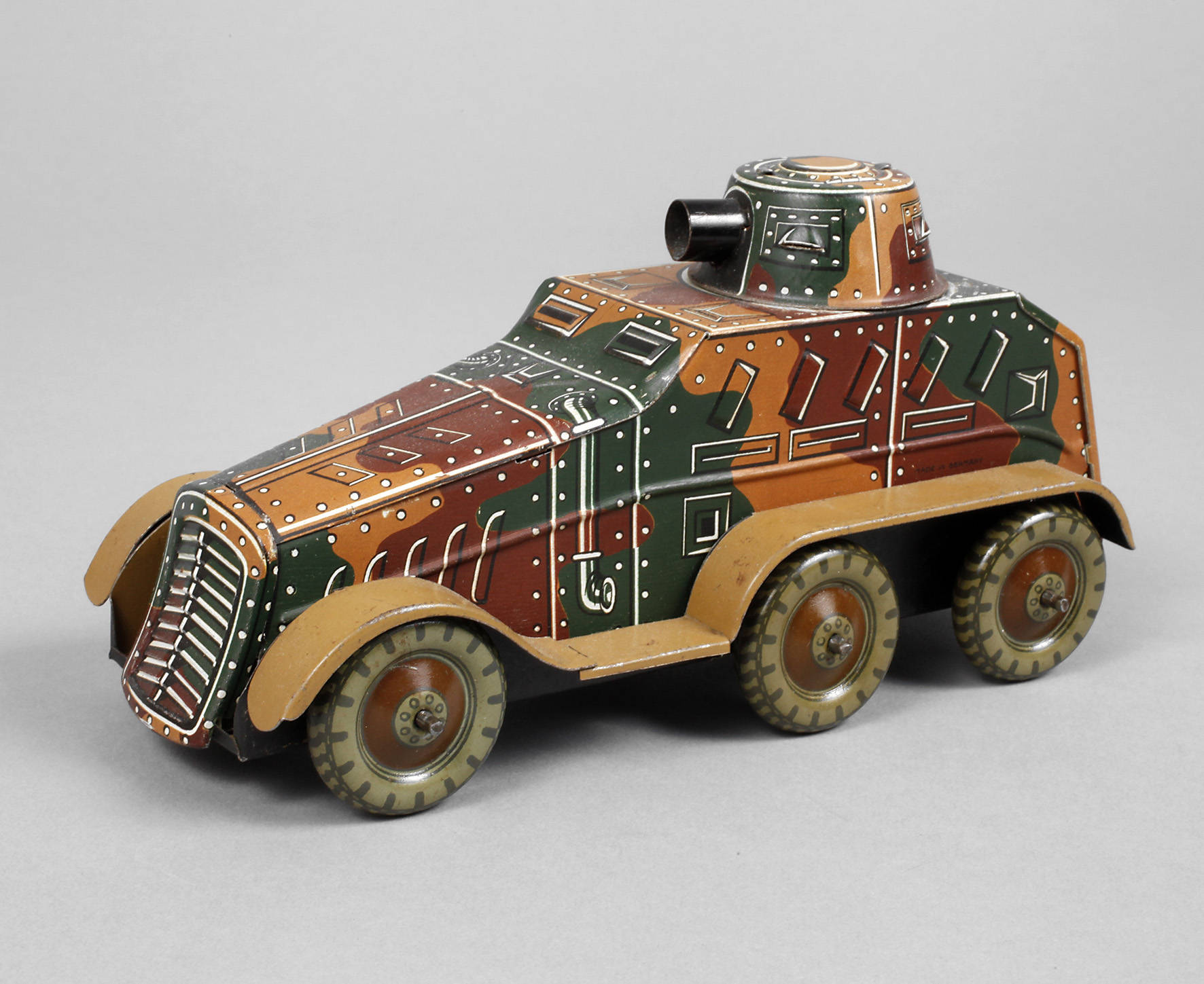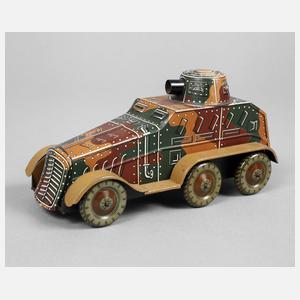 um 1940, gemarkt, Made in Germany, Blech lithogr., Mimikrylackierung, Uhrwerksantrieb intakt, mit Stopp-Go-Hebel sowie sich drehendem und funkenerzeugendem Geschützturm, ohne Schlüssel, min. bespielter Zustand, in Karton der Zeit, L 17,5 cm.