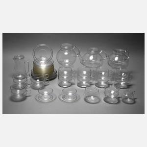 Entwurf für die Jenaer Glaswerke Schott & Gen. 1931, spätere Formvarianten, bestehend aus zwei Teekannen mit original Einsätzen, einer Deckelkanne, einem Wasserkrug, drei Sahnekännchen, drei Zuckerdosen, zwölf und sechs verschiedenen Tassen, 20 verschieden großen Untertassen und sechs Tellern, geringe Gebrauchsspuren, H max. 17 cm.