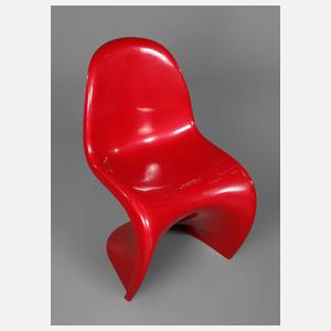 Entwurf Werner Panton 1959, an der Sitzunterseite gemarkt Fehlbaum Produktion, Ausführung 1971 für Herman Miller, z-förmiger Sessel aus rotem Kunststoff, normale Alters- und Gebrauchsspuren, H 83, SH 42 cm. Quelle: Barbara Mundt (1991): Produkt-Design 1900–1990, S. 185.