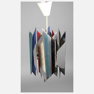 Entwurf 1962 für Lyfa, für die Neueröffnung des Restaurants Divan 2, im Vergnügungspark Tivoli in Kopenhagen, abgehängte trapezförmige Metallrefktoren teils farbig eloxiert, einflammig elektrifiziert, Alterspuren, H 32 cm, D 25 cm.