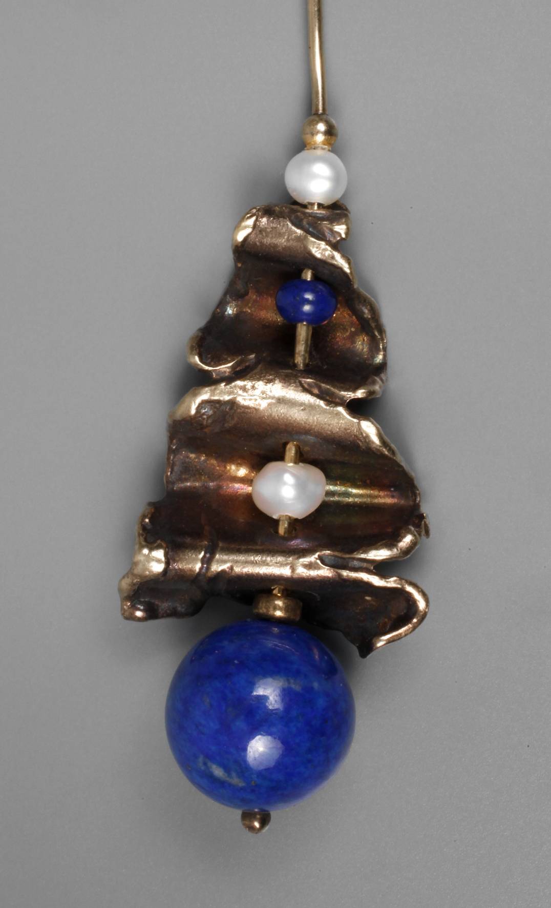 um 1970, Silber vergoldet, gestempelt 925, besetzt mit zwei Lapislazulikugeln von max. 12 mm und zwei Perlen, Stab etwas verbogen, L ca. 11cm, G ca. 8,0 g.