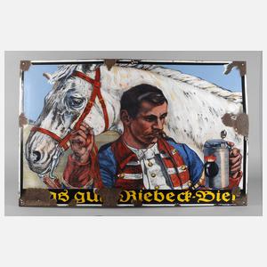 um 1910, undeutlich gemarkt Robert Dold Offenbach, langrechteckiges, gebauchtes Schild, mehrfarbig emailliert, vier originale Bohrungen, Randbereich mit größeren Emailverlusten, Z 3, Maße 78 x 118 cm.