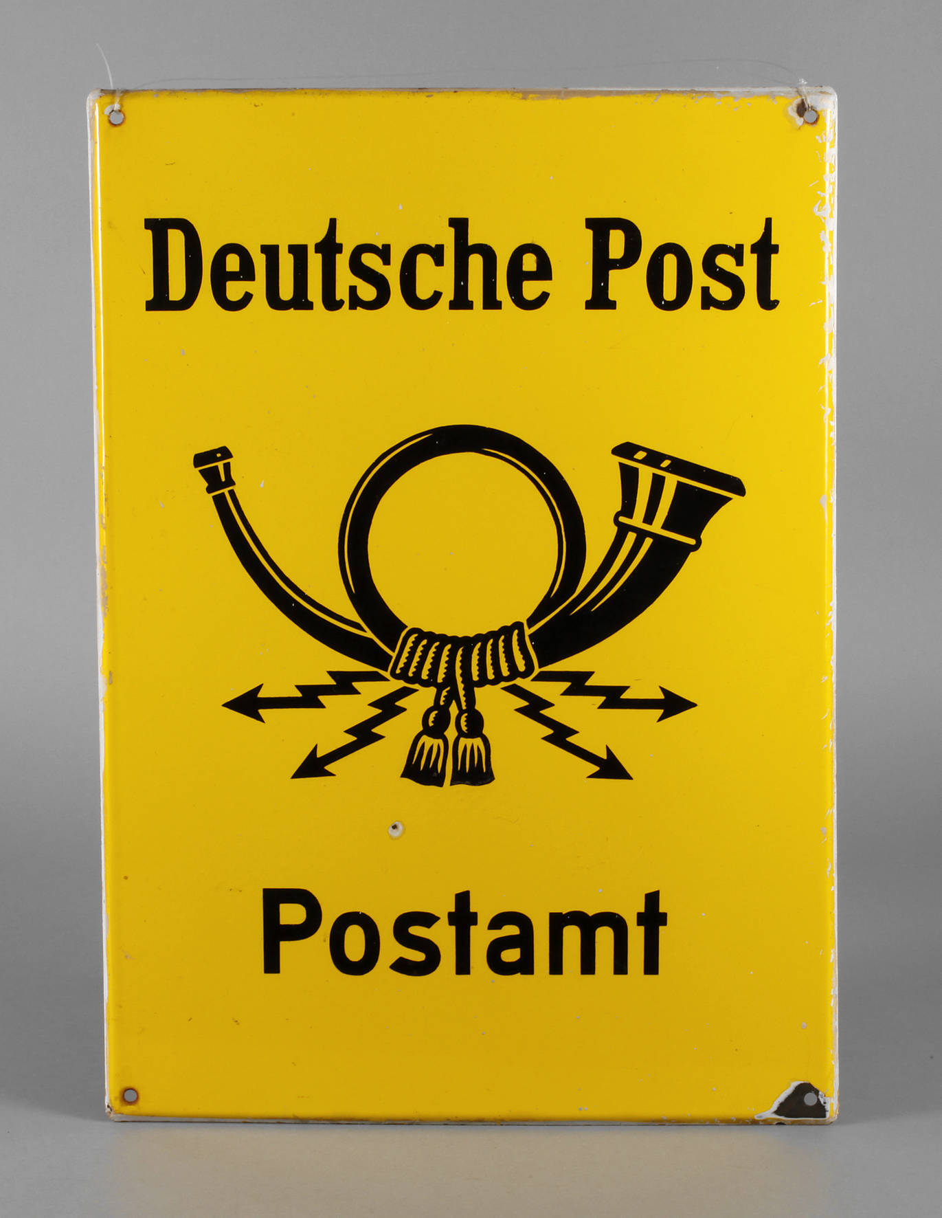 um 1950, ungemarkt, hochrechteckiges, flaches Schild, zweifarbig emailliert, vier orig. Bohrungen, gute Erhaltung mit kleinen Fehlstellen, Z 2, Maße 60 x 41 cm.