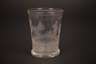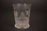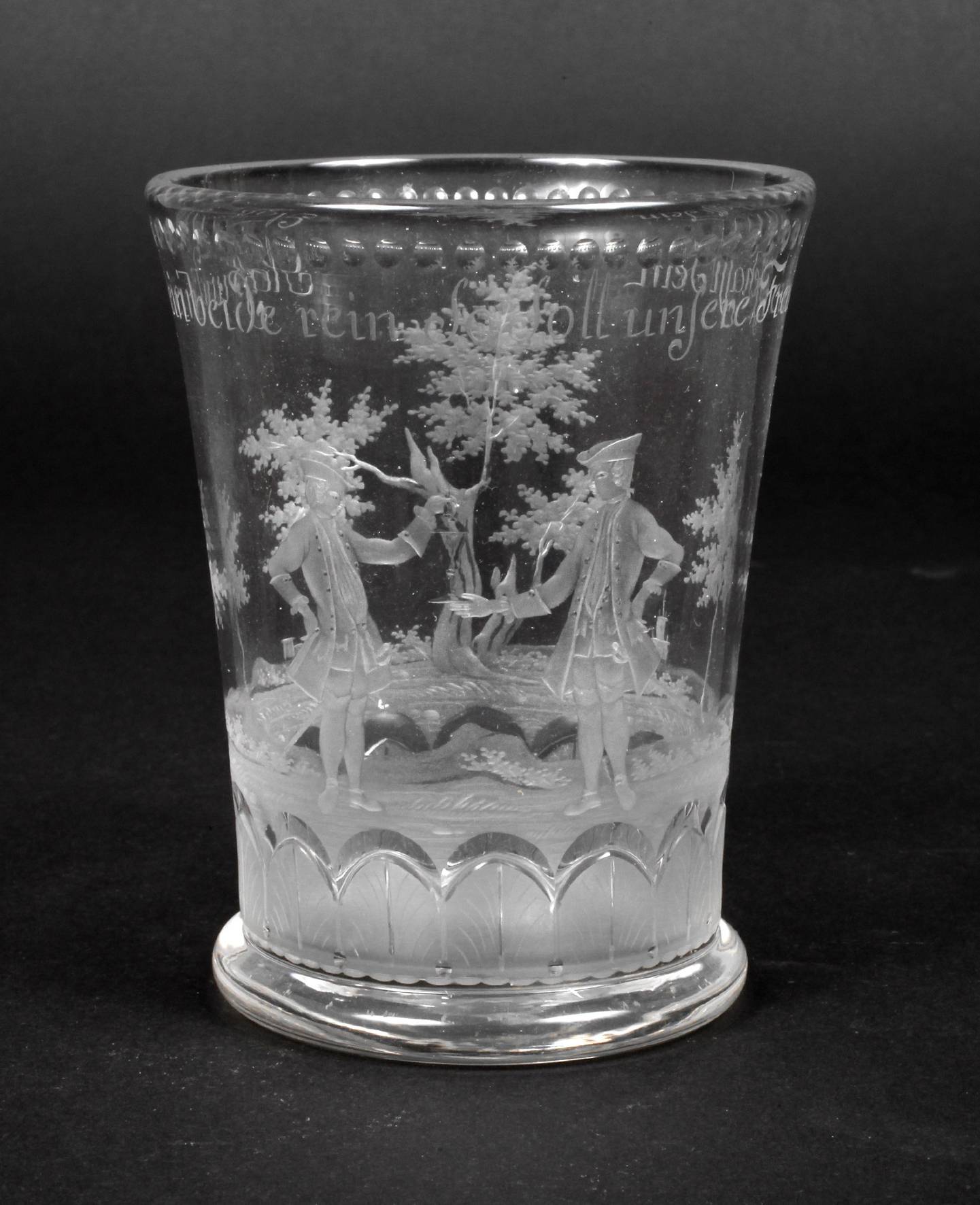 Anfang 19. Jh., klares Glas, ausgekugelter Abriss, leicht konische Form, mit Matt-, Kerb- und Kugelschliff, Landschaft mit zwei Soldaten in Uniform, Spruch: ”Glaß und wein beide rein So Soll unsere Freundschafft Sein”, über dem Stand Palmetten, gute Erhaltung mit geringen Altersspuren, H 10,5 cm.