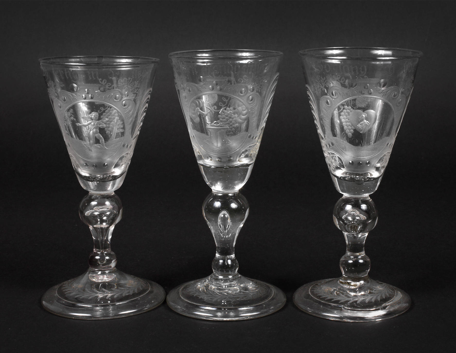 wohl Glashütte Glücksburg, kursächsische Glashütte in der Glücksburger Heide, unweit des Jagdhauses Glücksburg im Amt Seyda im heutigen Sachsen-Anhalt, um 1730, klares Glas, blasiger Abriss, der leicht gewölbte Scheibenfuß nach unten breit umgeschlagen, umlaufende Blattranke in Mattschliff, Balusterschaft mit eingestochener Luftblase, die konischen Kuppen ebenfalls matt geschnitten mit Kugelschliff, Wappen mit Symbolik und Wahlsprüchen: ”allseits standhafftig”, ”so lang ich lebe”, ”sey fertig in der liebe”, mit Amorette, rückseitig je eine Weinrebe mit Blättern, sehr guter Originalzustand, ohne Beschädigungen, selten, H 15,5 cm.