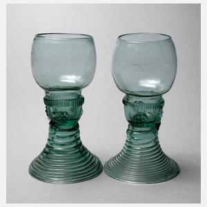 norddeutsch oder Holland, 17. Jh., der ausgestellte Fuß aus einem Spiralfaden hergestellt, daran der angesetzte Schaft mit blasigem Abriss, dieser hohl in die kugelige Kuppa übergehend, Schaft mit aufgesetzten Beerennuppen und einem umlaufenden gekniffenen Faden, von der Herstellung etwas schief, sonst jedoch gute unbeschädigte Erhaltung, mit geringen Gebrauchsspuren, H je 12,5 cm.