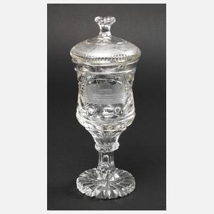 Schlesien, 1. Hälfte 19. Jh., klares Glas, Walzenschlifffuß, der facettierte Schaft mit eingestochener Luftblase, schauseitig eine Ovalkartusche mit matt geschnittener Ansicht des Brunnens, rückseitig Dr. A. Arnhold, der Deckel mit feinem Floraldekor, Mündung mit einer winzigsten Kerbe, sonst sehr gute Erhaltung, H 21,5 cm.