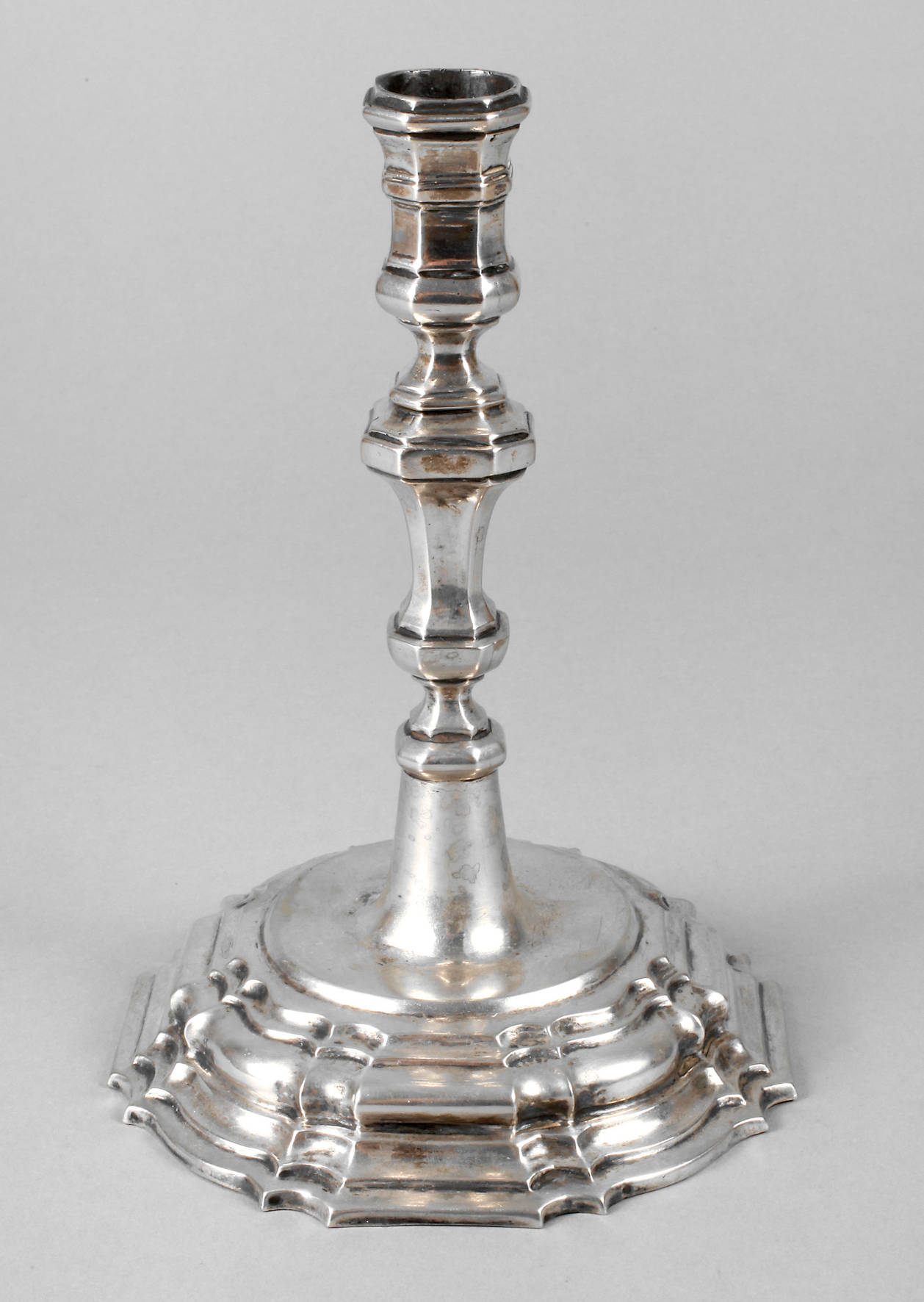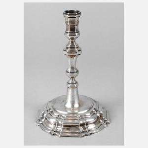Braunschweig, um 1716–1730, gestempelte Stadtmarke, Meistermarke LS für Ludewig Spitta, Meister ab 1699, siehe Rosenberg Nr. 1326, Tremulierstich, siebenfach getreppter, breiter Standfuß mit schlankem facettierten Schaft, hohl gearbeitet, ohne Tropfschale, altersgemäß guter Zustand, H 19 cm, G ca. 349 g.