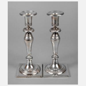 Breslau, um 1820, Meister Tobias Meyer (gestorben 1824), gestempelter Schriftzug Breslauer Stadtmarke, weiterer Buchstabe F und Q im Kreis, fein getriebene, elegante Leuchter, hohl gearbeitet und fein graviert, umlaufende Ornamentbänder, unter der Tülle Palmetten, herausnehmbare Tropfschalen, graviertes Besitzermonogramm C.G.S., einer am Stand mit kleinem Einriss, sonst sehr gute originale Erhaltung mit geringen Gebrauchsspuren, H 21 cm, G ca. 414 g.