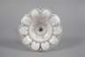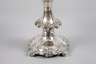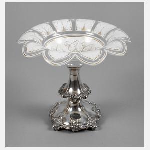 datiert zum 30. November 1851, ungestempelt, Silber geprüft, fein getriebene Blüten- und Blattmotive, hohl gearbeitet, der Aufsatz aus klarem Glas mit weißem Überfang, Schälschliff und Goldbemalung, diese stärker berieben, unbeschädigt, H 19,5 cm.