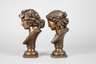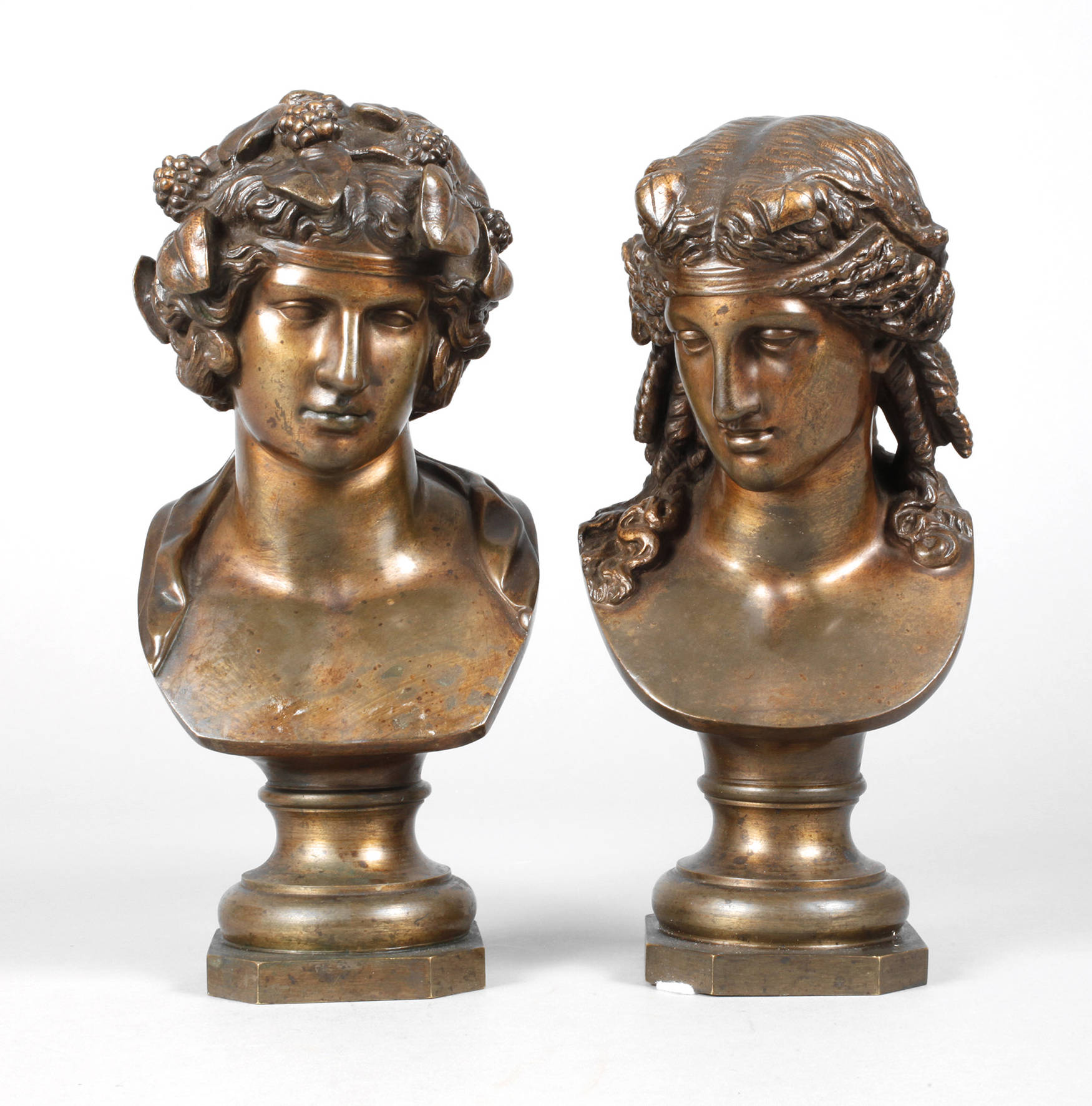 Frankreich, Ende 19. Jh., sign., Bronze dunkel patiniert, antikisierende Bruststücke der griechischen Gottheiten Ariadne mit aufwendig gebundenem Haar und Bacchus, das Haupt von Weinreben bekrönt, in Sockel auslaufend, Altersspuren, H max. 26 cm.