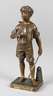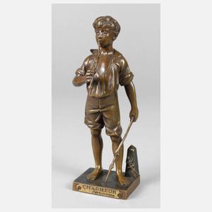 um 1900, auf der Plinthe signiert Lavergne, recto auf Messingschild bezeichnet Charmeur Par Lavergne, auf der Unterseite mit Modellnummer 23834, Bronze braun patiniert, Lausejunge barfuß beim Flötenspiel, auf der Flöte und Plinthe je eine Eidechse, auf flacher quadratischer Plinthe mit kleinem Obelisken, Patina berieben und mit Altersspuren, sonst gut erhalten, H gesamt 17 cm. Künstlerinfo: Pariser Bildhauer (war tätig ca. 1852–1903), war Schüler von François Jouffroy, beschickte 1863, 1876 und 1892 den Pariser Salon, einige Arbeiten von ihm waren im Museé in Périgeux ausgestellt. Quelle: Internet.