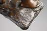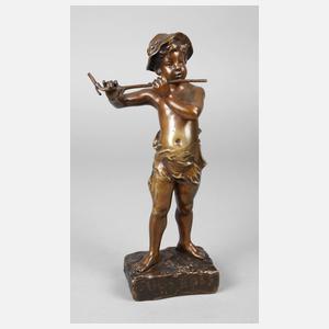um 1900, verso auf der Plinthe signiert M. Debut, recto betitelt ”Sous Bois” (Unterholz), Bronze hellbraun patiniert, spielender Knabe im Lendenschurz mit Hut, einen Stock als Querflöte benutzend, auf naturalistischer Plinthe mit vegetabilen Elementen, Patina berieben und mit Altersspuren, H gesamt 26,5 cm.