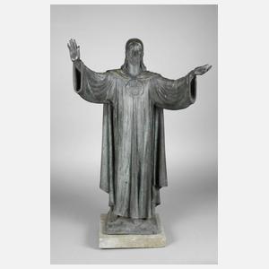 1930er Jahre, seitlich an der Plinthe signiert C. A. Smout, verso mit unleserlichem, wohl niederländischem Gießereisignet Brons Giererij Deplastiek...?, Bronze mit grüner Patina, Darstellung des Jesus im langen Gewand mit erhobenen Armen, auf der Brust ornamentale Darstellung des Heiligsten Herz Jesu, auf kleiner quadratischer Plinthe, auf einen quadratischen Sandsteinsockel montiert, Altersspuren, H Bronze 73,5 cm, H gesamt 78,5 cm.