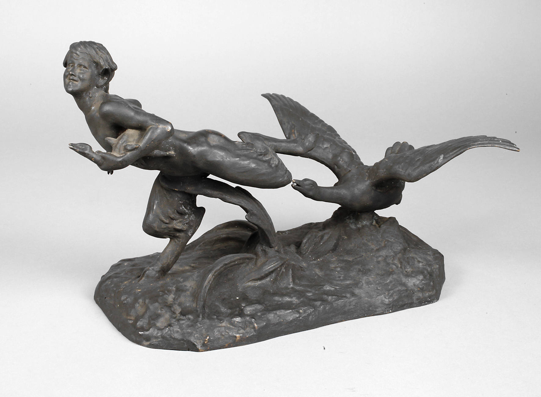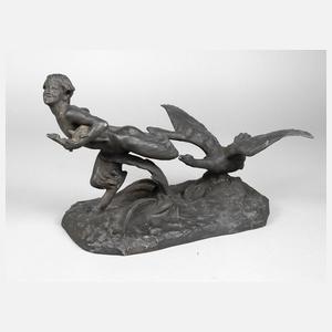 Anfang 20. Jh., auf der Plinthe signiert Prof. V. Seifert., Bronze dunkel patiniert, Darstellung eines jungen Fauns beim Diebstahl zweier Gänseküken, verfolgt von der Gänsemutter, geringe Altersspuren an der Patina, L 33 cm. Künstlerinfo: deutscher Bildhauer (1870 Wien bis 1953 Berlin), Victor Seifert wurde als Sohn des Garteninspektors Franz Seifert und der Franziska Seifert, geb. Franz, geboren. Er besuchte Schulen in Wien und München und studierte am Kunstgewerbemuseum. Zu weiteren Studien ging er an die Berliner Kunstakademie. Er studierte bei Ernst Herter, Ludwig Manzel und Peter Breuer. Studienreisen führten ihn 1903 nach Paris, 1905 nach Italien und 1910 nach Brüssel und London. Dresslers Kunsthandbuch, Band 2, Seite 945 weist ihn als Professor aus, 1930 wohnte er Berlin W, Lietzenburger Straße 31. Seifert war Mitglied der Künstler-Genossenschaft und des Künstlervereins der Bildhauer. Quelle: Thieme-Becker und Internet.