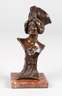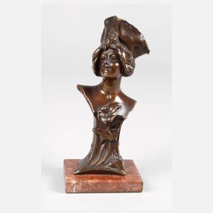 um 1900, seitlich signiert V. Seifert., Bronze dunkelbraun patiniert, Brustbild einer jungen Dame mit Hut und frech vorgestrecktem Kinn, in einen schlanken Stand mit floralen Jugendstilelementen und Blüten übergehend, auf einen rötlichen flachen Marmorsockel montiert, gute Erhaltung mit wenigen Altersspuren, H Bronze 13 cm, H gesamt 14 cm. Quelle: Harold Berman, Bronzes Sculptors & Founders, Volume 2, S. 345, Nr. 1261. Künstlerinfo: deutscher Bildhauer (1870 Wien bis 1953 Berlin), Victor Seifert wurde als Sohn des Garteninspektors Franz Seifert und der Franziska Seifert, geb. Franz, geboren. Er besuchte Schulen in Wien und München und studierte am Kunstgewerbemuseum. Zu weiteren Studien ging er an die Berliner Kunstakademie. Er studierte bei Ernst Herter, Ludwig Manzel und Peter Breuer. Studienreisen führten ihn 1903 nach Paris, 1905 nach Italien und 1910 nach Brüssel und London. Dresslers Kunsthandbuch, Band 2, Seite 945 weist ihn als Professor aus, 1930 wohnte er Berlin W, Lietzenburger Straße 31. Seifert war Mitglied der Künstler-Genossenschaft und des Künstlervereins der Bildhauer. Quelle: Thieme-Becker und Internet.