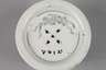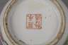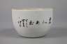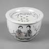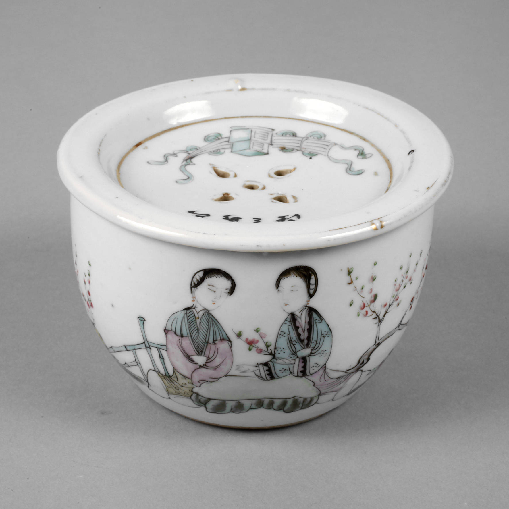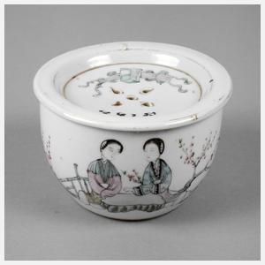 China, um 1920, am Boden mit Vier-Zeichen-Marke, Weißporzellan in polychromer Emailbemalung, tief gemuldete Schale, Wandung umlaufend figurativ verziert und mit Kalligraphie staffiert, flach aufgelegter Deckel durchbrochen gearbeitet und mit Resten alter Vergoldung, brandfleckig, berieben, H 6,5 cm, D 10,5 cm.