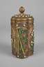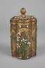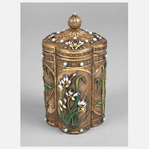 2. Hälfte 20. Jh., Silber vergoldet, gestempelt Silver, Filigranarbeit, aus feinen Silberdrähten ornamental gestaltet, emaillierte, aufgelegte Blütenmotive und Türkiscabochons, Teedose mit abnehmbarem Deckel, normale Altersspuren, H 17 cm, G ca. 445 g.