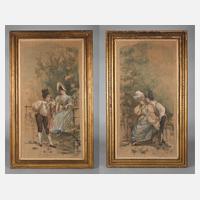 Anfang 19. Jh., unsigniert, profilierte Rahmung mit beidseitiger Gobelin-Malerei, jeweils polychrome Darstellung eines Liebespaares in angedeuteter Landschaft, ohne Gestell, Altersspuren, Maße 86 x 50 cm.