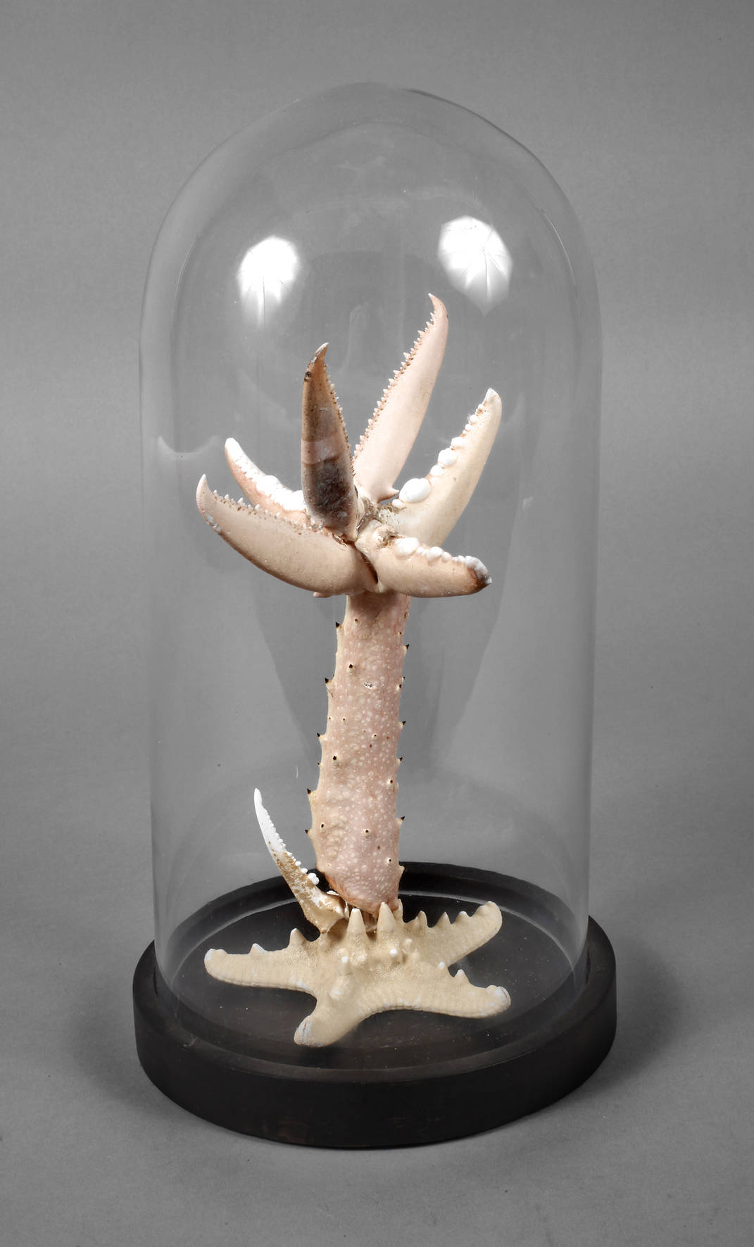 20. Jh., Komposition aus Seestern sowie montierten Teilen von Krustentieren, unter Glassturz, H 32 cm.
