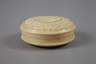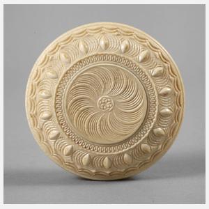 wohl um 1700, Elfenbein zweiteilig gearbeitet und fein beschnitzt, Runddeckeldose mit aufwendig ornamental verziertem Oberteil, Zarge mit kurzem Trocknungsriss, sonst guter, dem Alter entsprechender Zustand, D 6,6 cm.
