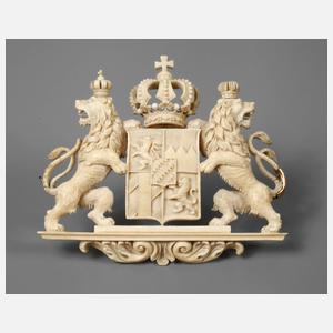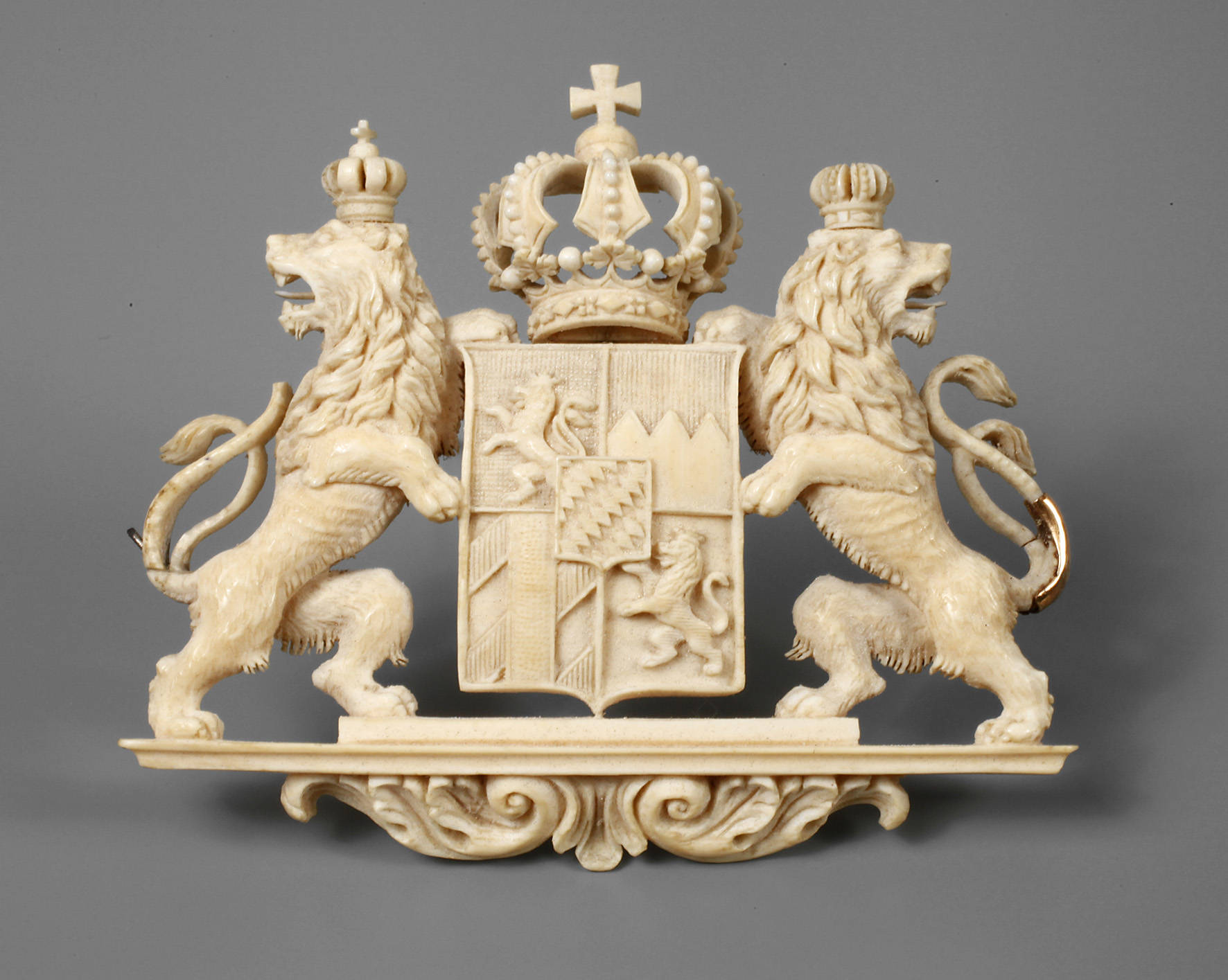 Anfang 19. Jh., fein geschnitztes Wappen mit Krone, flankiert von je einem zweischwänzigen stehenden Löwen auf Sockel mit Rankenwerk, ein Schwanz mittels Goldblech repariert sowie weitere Reparaturstellen, rückseitig Nadel, Maße ca. 70 x 80 mm, leichte Tragespuren, G ca. 29,8 g.