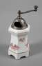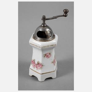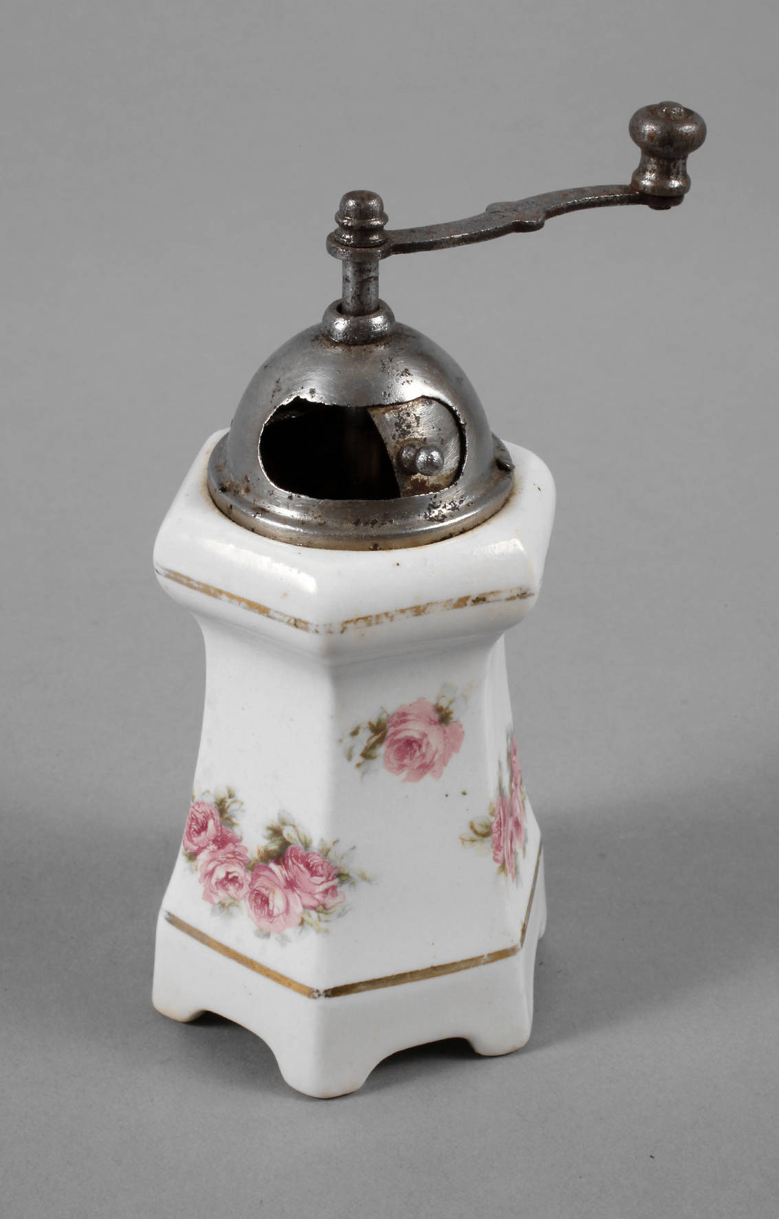 Max Roesler/Rodach, um 1920, gemarkt, Werk gestempelt PeDe, Kurbel aus Stahl mit beweglichem Griff, Korpus Steingut, farblos glasiert, mit Röschenfestons bedruckt und vergoldet, Gebrauchsspuren, etwas reparaturbedürftig, H gesamt 12,5 cm.