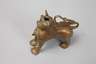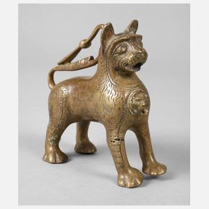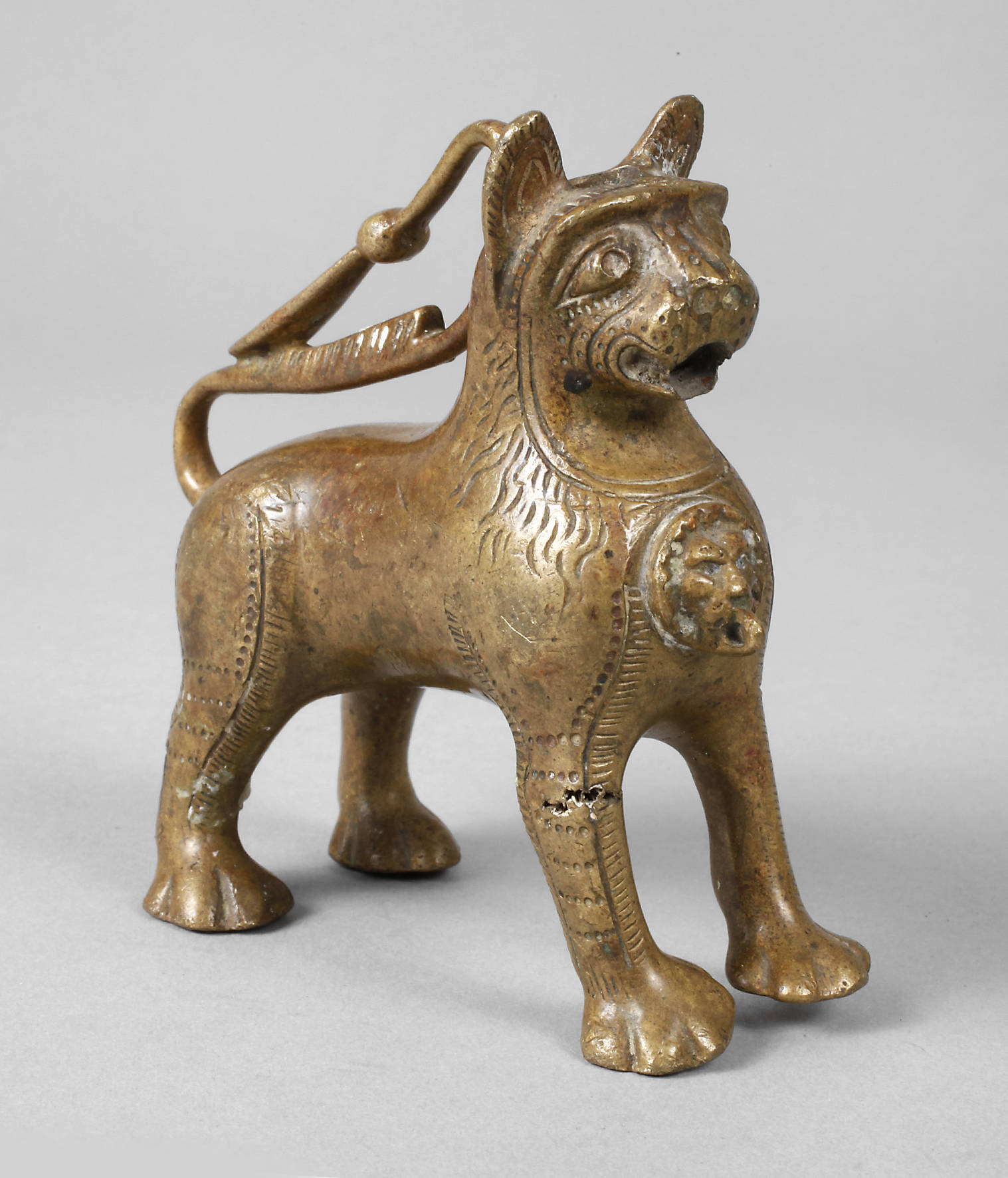Ende 19. Jh., ungemarkt, Bronze gegossen, rituelles Gefäß zur Handwaschung in Form eines fein gravierten Löwen, nach antikem Vorbild, Vorderlauf mit Rissbildung, L 8,5 cm.