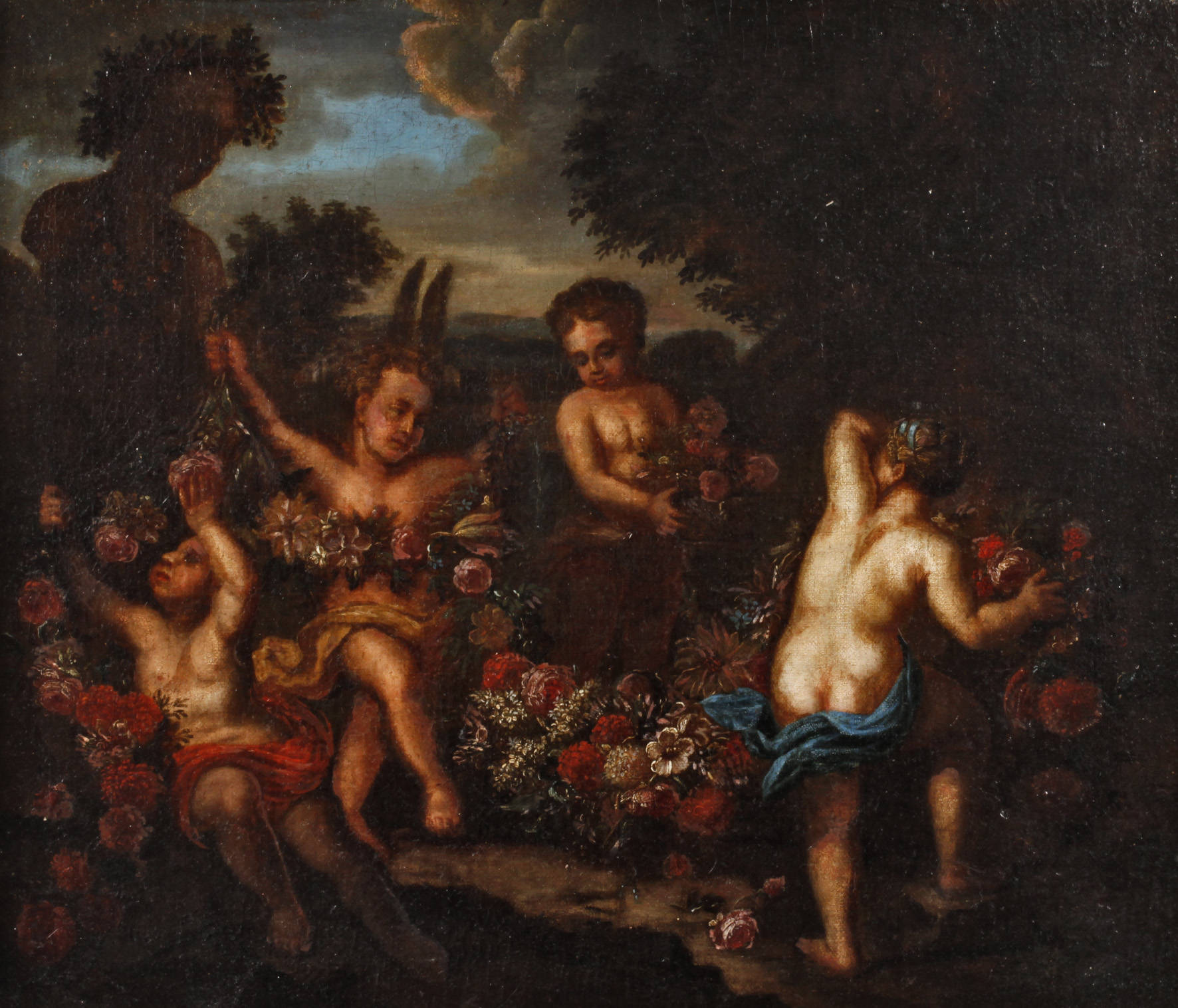 Putti mit Blumengirlande, zu Füßen einer Hermenplastik, in sommerlicher Parklandschaft in der Abenddämmerung, effektvolle, lasierende, teils minimal pastose barocke Genremalerei, Öl auf Leinwand, 18. Jh., unsigniert, rückseitig auf dem Spannrahmen rotes Lacksiegel, Craquelure, doubliert, restauriert, original in barockem Goldstuckrahmen (Vergoldung übergangen, Erhaltungsmängel) gerahmt, Falzmaß 50,5 x 58,5 cm.