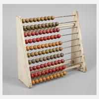 Frankreich, um 1800, mahagonifurniertes Gestell mit zarten Ziereinlagen aus Messing sowie Messingmontierung, gedrechselte, teils geschwärzte Rechensteine aus Buche massiv, Altersspuren, Reste alten Holzwurmbefalls, H 41,5 cm, B 28 cm.