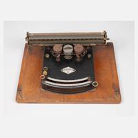 um 1924, auf dem Gehäuse gemarkt, geschwärzter Eisenkorpus, Index-Schreibmaschine mit Typenzylinder, auf Buchenholzplatte montiert, Alters- und Korrosionsspuren, Maße 29 x 24 cm.